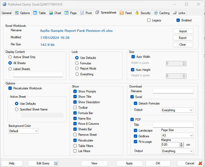 This option takes the whole workbook and publishes a copy into the Sharperlight Publisher on the server as a new type of published report (Spreadsheet). When a workbook is first published, the user is presented with the Spreadsheet options tab in Publisher where the default options may be changed.