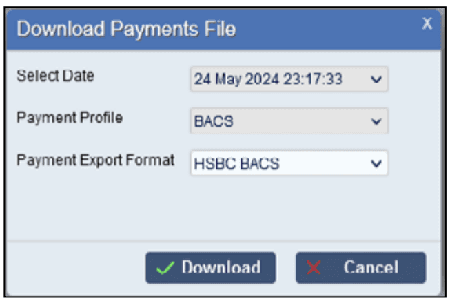 A second export format can also be specified if it is for the same bank, such as using BACS or Faster Payments. When the user selects a payment file to download, they are given the option of which format to use.