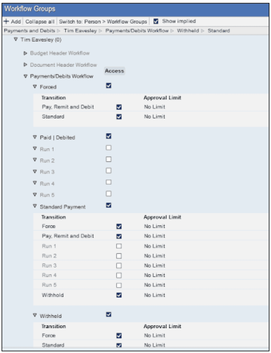 A new Workflow Group (Payments and Debits) has been created for this purpose and populated to give all existing Pro users the equivalent Payments permissions as before the upgrade. These permissions may be tailored to refine an individual’s permissions and utilise the additional payment states as required.