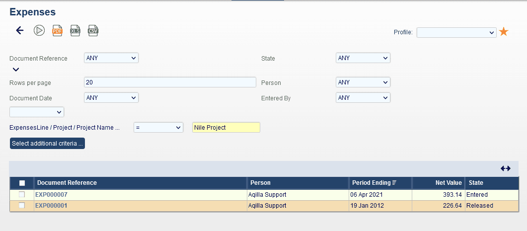 Expense Enquiry can be used to select expense documents based on the contents of individual expense lines. This is available using the “Select additional criteria” button. Selecting a filtered expense document will display the full contents of that expense document.