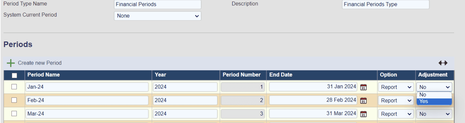 A new flag has been added to indicate that the period is an “Adjustment” period. Typically, this is Period 13 of a financial year. This flag will be used in future asset depreciation functionality.